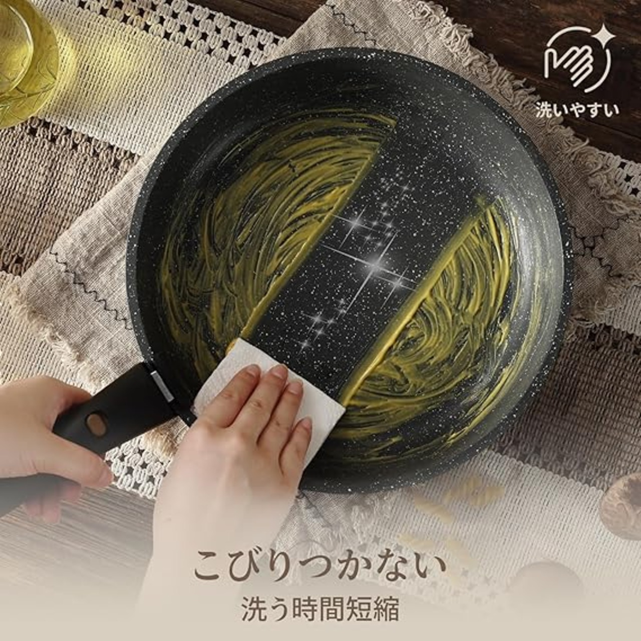 【快適な調理体験】内面がマーブルコートをしているため、くっつきにくくスムーズに調理できます。調理後もスポンジで軽く拭くだけで、汚れもスルッと落ちます