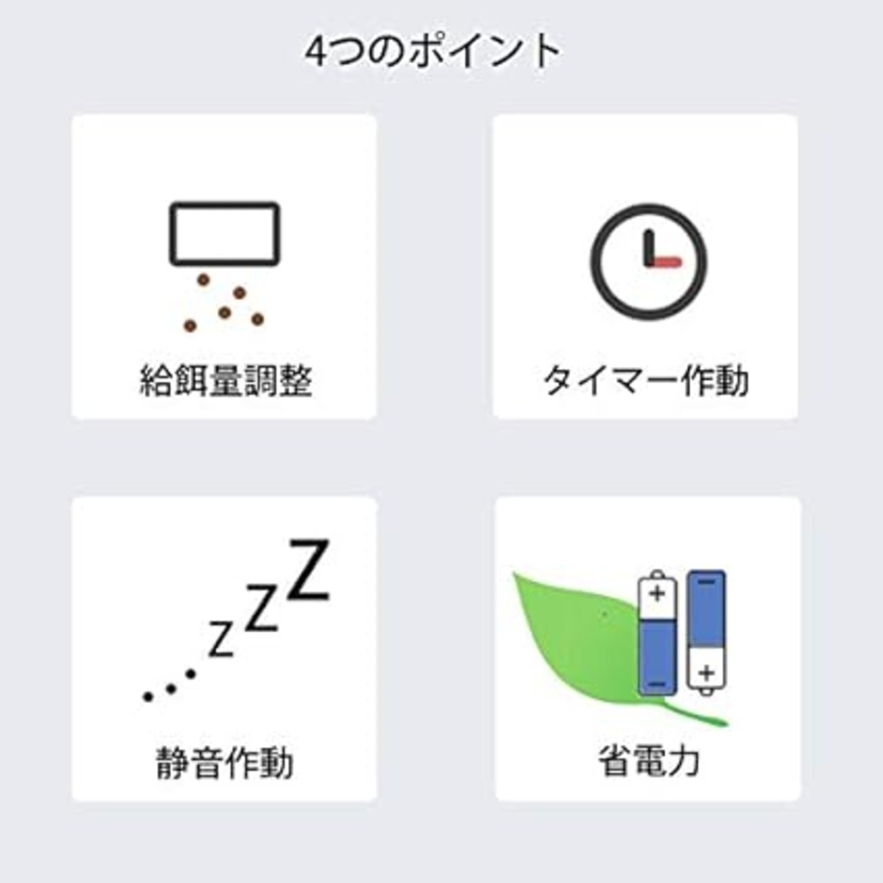 ・付属品:給餌器本体、固定用ブラケット、簡易日本語説明書