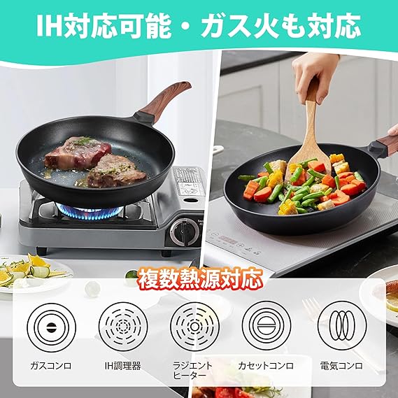【複数熱源対応&均一加熱】IHやガス火などの熱源に対応しています。対応熱源:ガスコンロ、IH調理器、ラジエントヒーター、カセットコンロ、電気コンロ。底部はステンレス製の磁化ベースを採用しており、急速な熱伝達を実現、ガスコンロやIH調理器を使用しても均一に加熱できます。