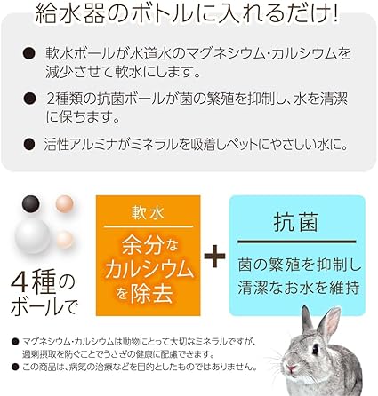 給水器のボトルに入れるだけ!4種のボールで、余分なカルシウムを除去し軟水に!菌の繁殖を抑制し、清潔なお水を維持 ボトルの口をふさがない安心構造 給水器のボトルに入れるだけ! 軟水ボールが水道水のマグネシウム、カルシウムを減少させて軟水にします。 2種類の抗菌ボールが菌の繁殖を抑制し、水を清潔に保ちます。 活性アルミナがミネラルを吸着しペ