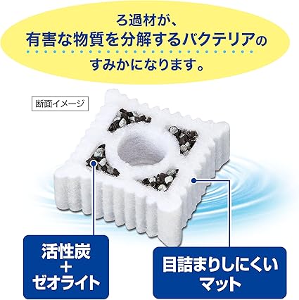 目詰まりしにくいマットの中に「活性炭」+「ゼオライト」を配合したろ過材が魚に有害な物質を分解するバクテリアのすみかになります。