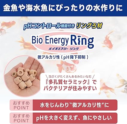魚ごとに『好きな水』があるって知ってましたか? 水の性質が合わないと魚にストレスがかかってしまいます。 pHが合っていないとストレスや病気のリスクになり、 pHが合っていると魚は元気に泳ぎ、エサもよく食べます。 バイオエナジーリングが最適な水質に近づけます。