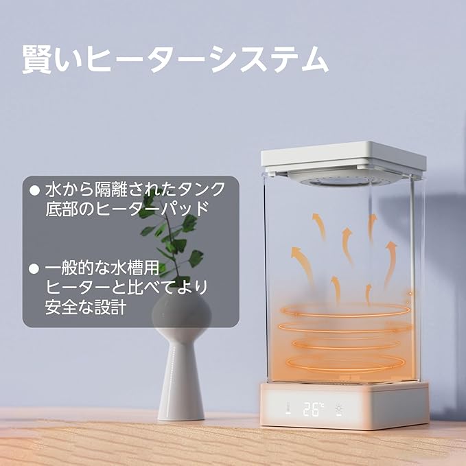温度管理機能: 20-30°Cの範囲で好みの温度に設定可能で、熱帯魚の飼育に最適です。ご注意:周囲の温度が設定温度を超えた場合、積極的に冷却することはできません。