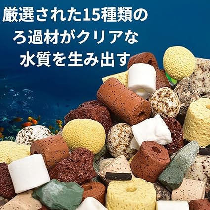 【プレミアム配合の高コスパ設計】浄水培養リング・バクテリアリング・火山石・麦飯石・珊瑚骨など、15種類の高性能ろ過材を厳選配合。ろ過力の向上を目指し、形状や機能の異なる素材を緻密に構成しました。バクテリアの活性化や水質改善、水槽環境の安定化に優れた効果を発揮しながら、同類レベルの商品の中でも「最高レベルのコスパ性」を実現しています。クリアな水質を支えるためのまとめ買い商品として、自信を持ってお届けします。※撮影用画像にある花形ろ過材は演出用です。実際の商品は円柱タイプとなります。※ご使用前には一