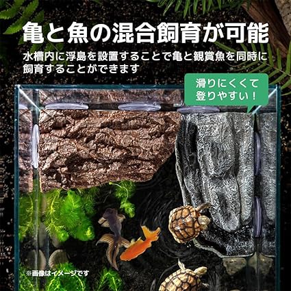 半水生カメや水生爬虫類のために設計された浮遊プラットフォームです。3つの強力な吸盤で固定するので安定感抜群!カメが快適に甲羅干しや日光浴を行える理想的な環境を提供します。自然に近いデザインで、水槽の景観にもマッチし、水生造園にもぴったりのアクセサリーです。