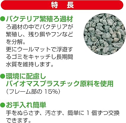 バクテリア繁殖ろ過材・・・ろ過材の中でバクテリアが繁殖し、残り餌やフンなどを分解。更にウールマットで浮遊するゴミをキャッチし長期間水質を維持します。