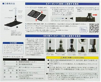 セット内容:ベースフィルター×4枚、吐出口、スライドパイプ、ホルダー、パイプ、パイプホルダー、エアーストーン、エアーチューブ、ジョイント