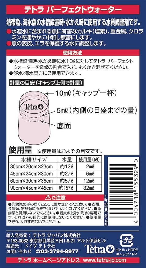 熱帯魚のための安全な水が1本で簡単に作れます。水槽設置時、水替え時に、水道水を熱帯魚にとって理想的な水に速やかに調整する、オールインワンタイプの大変便利な水質調整剤です。