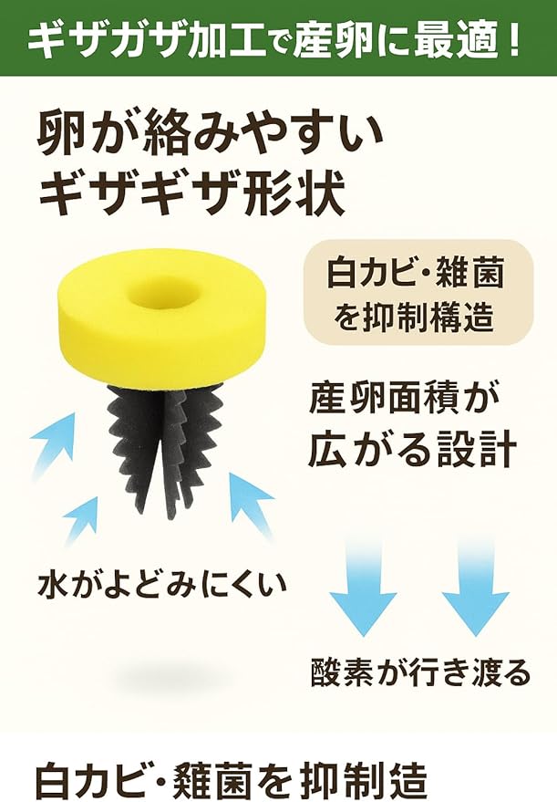 【白カビ抑制ギザギザ足で孵化率アップ!】 卵がしっかり絡みつく独自形状で、産卵・孵化をサポート。水通しが良く酸素が行き渡るので、卵がカビにくく、白カビを抑制し孵化率向上!