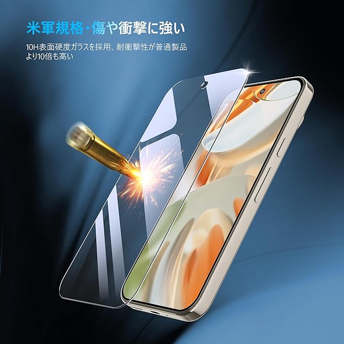 【硬度10H超え・圧倒的な耐衝撃力】日本AGC社製強化ガラス基材を使用し、14種類の先端加工技術を駆使することで、米軍MIL規格の2倍厳しい試験条件をクリアしています。スマートフォンがカバンの中で鍵などの鋭いものにぶつかっても傷が付きにくく、スマホの画面をしっかり保護します。