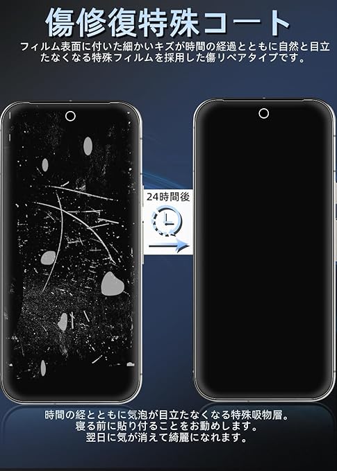 【コーティング表面処理】1.TPE特殊な修復塗装。傷修復性と成形性に優れる自己治癒コートフィルム。日本TPU製フイルム材料は普通のガラスチック製のフィルムより強靭性があり、48時間以内に小さな傷を自動修復し、自然に消えます。2.MPV汚れを防止する塗装。『特殊コーティング』により、表面は滑らかです。水滴が玉のように弾くほどの撥水・加工がされ、指紋や汚れなど付きにくく、拭けばすぐに綺麗になり、いつでも画面がツルツルの状態で操作で