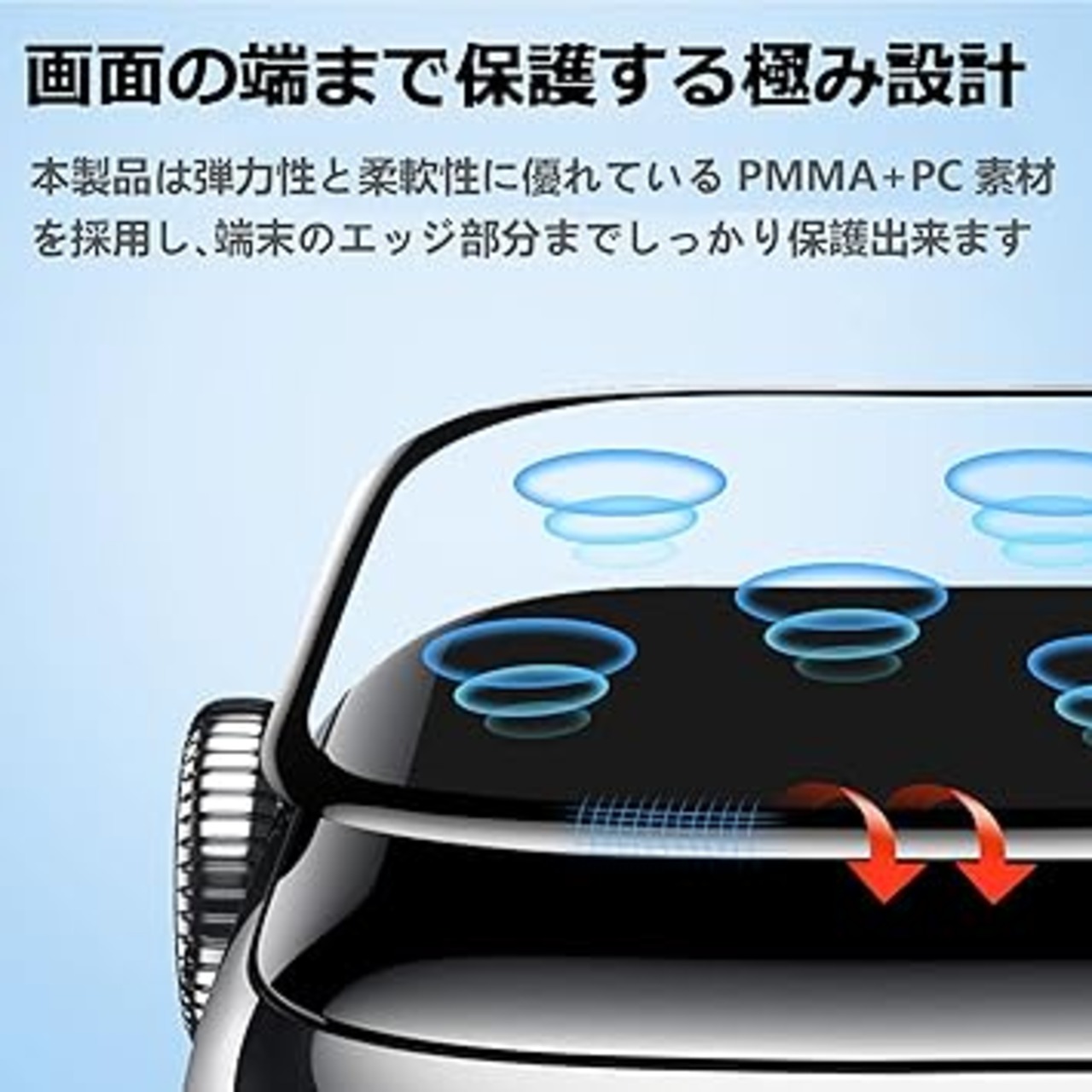 【PMMA+PC素材】本製品は弾力性と柔軟性に優れているPMMA+PC素材を採用し、端末のエッジ部分までしっかり保護出来ます。PMMA+PC素材と霧吹きの組み合わせのため、張り付け失敗でも、フィルムを剥がしもう一度貼り直すことができる。(ただ、エッジ部分を押してから、貼り直すことができないことをご了承ください。