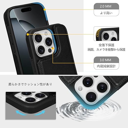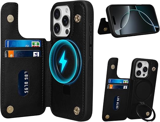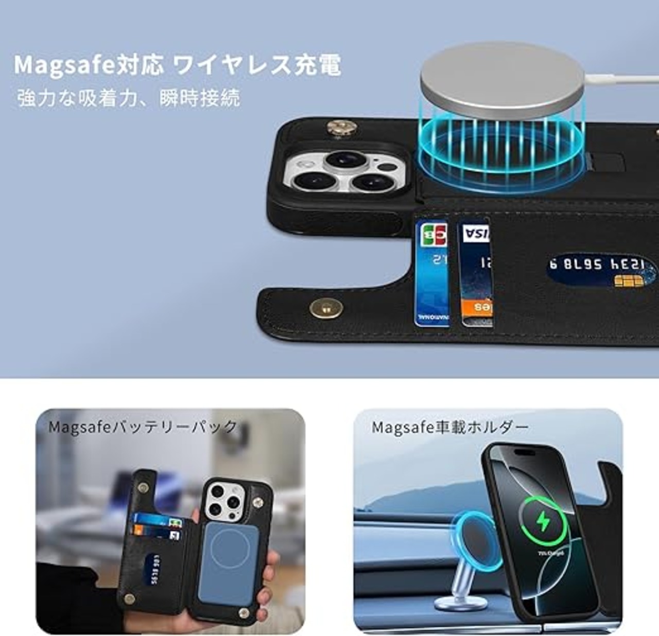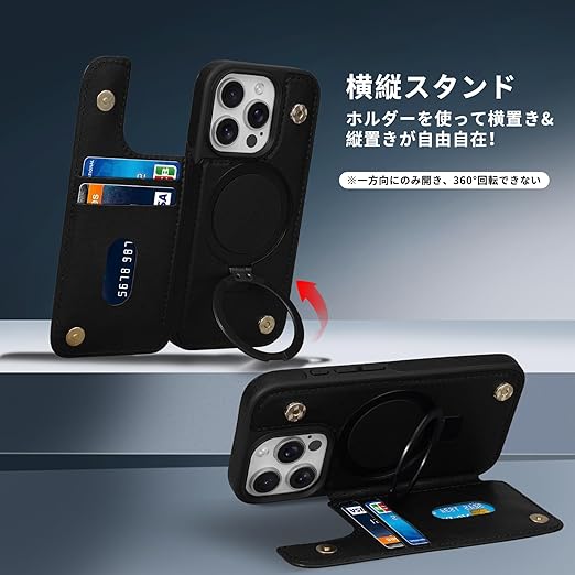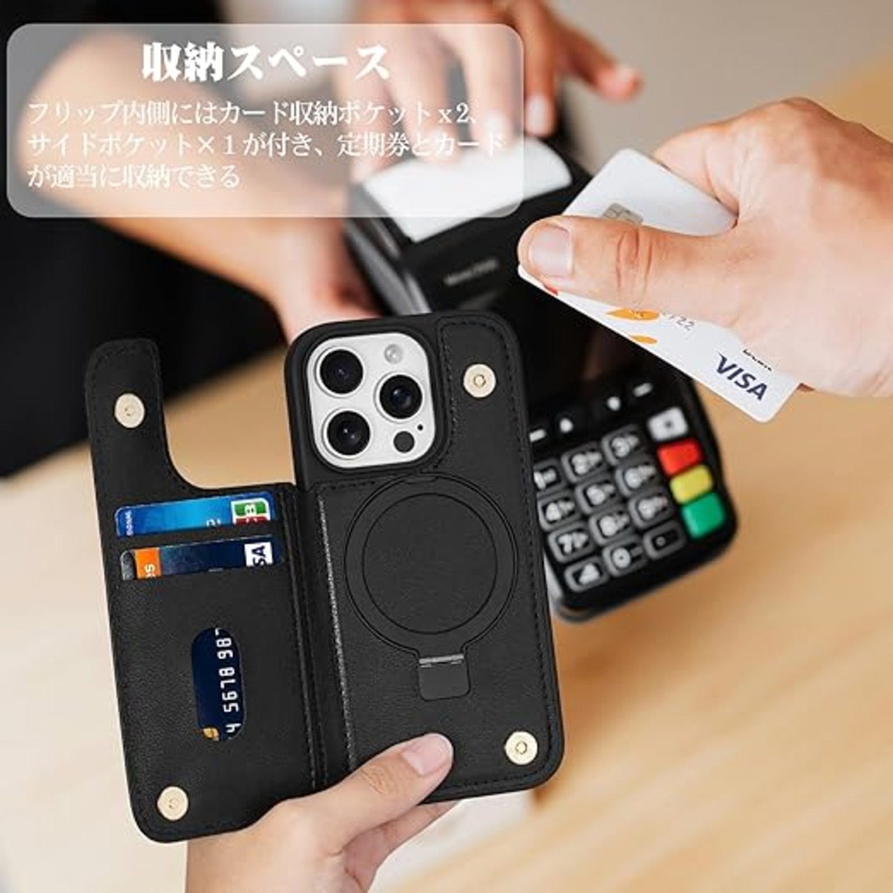 Shlybaay iPhone16 Pro 用 ケース Magsafe対応 背面 手帳型 カード マグセーフ いPhone 16 Pro 用 背面ケース 手帳型ケース スマホケース ワイヤレス充電 スタンド リング ホルダー カード収納 アイホン 16 プロ 用 カバー マグネット おしゃれ ファッション 6.3inch T1M ブラック a