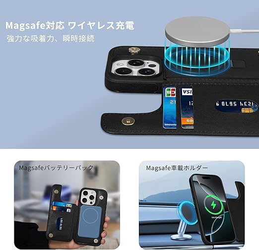 【MagSafe対応】ケースを装着したままMagSafeワイヤレス充電が可能です。磁石でしっかりと充電器に固定されるので、充電中にケースがずれる心配もありません。さらに、車載ホルダーやモバイルバッテリーな