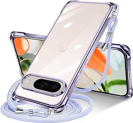 Google Pixel 9 / Pixel 9 Pro 用 ケース クリア ショルダー pixel9 / 9pro 用 スマホケース ピクセル 9 カバー 肩掛け 斜めかけ 縄掛けケース 透明 薄型 軽量 TPU 紐付き 斜めがけ 織りストラップ付き ネックストラップ ショルダー ケース 縦/横 2WAY 長さ調整可能 取り外し可能 落下防止 紛失防止 ワイヤレス充電対応 (パープル) a