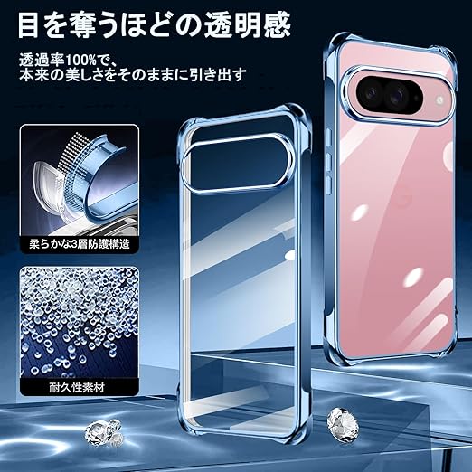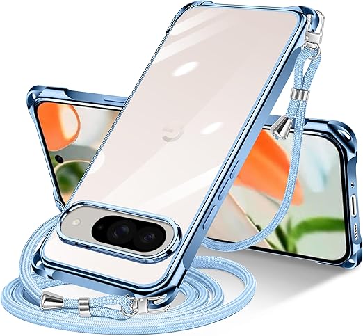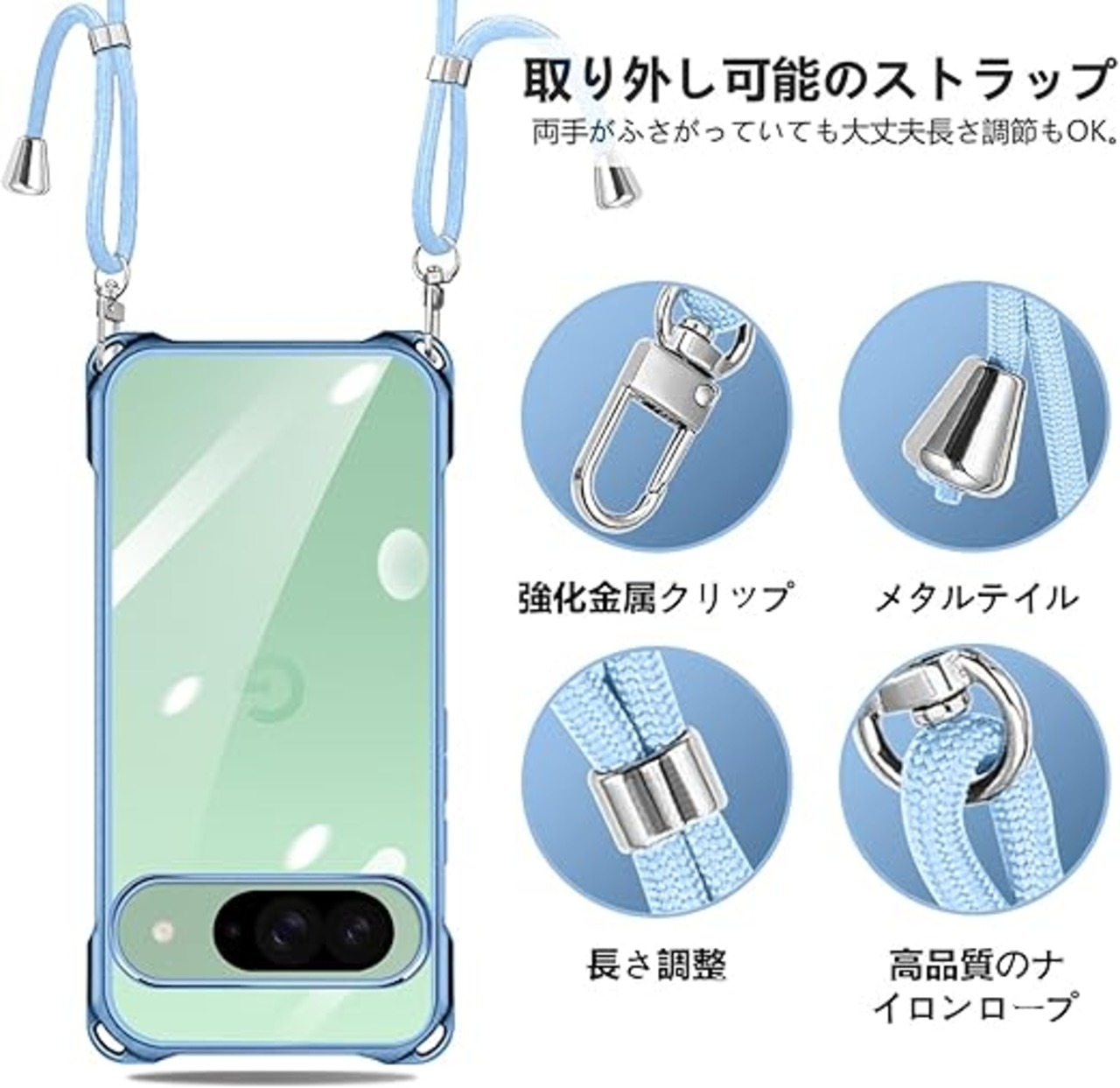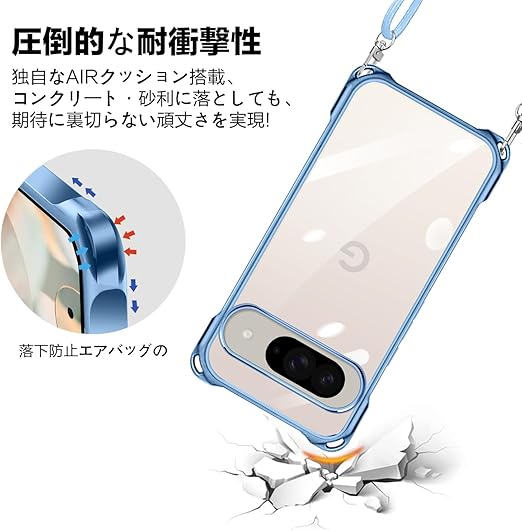 Google Pixel 9 / Pixel 9 Pro 用 ケース クリア ショルダー pixel9 / 9pro 用 スマホケース ピクセル 9 カバー 肩掛け 斜めかけ 縄掛けケース 透明 薄型 軽量 TPU 紐付き 斜めがけ 織りストラップ付き ネックストラップ ショルダー ケース 縦/横 2WAY 長さ調整可能 取り外し可能 落下防止 紛失防止 ワイヤレス充電対応 (ブルー) a