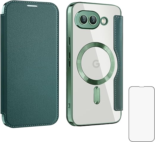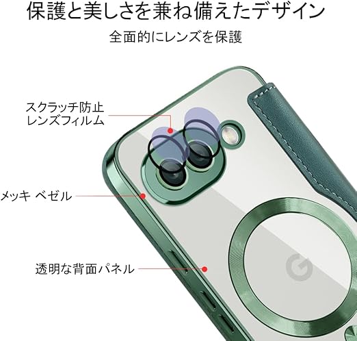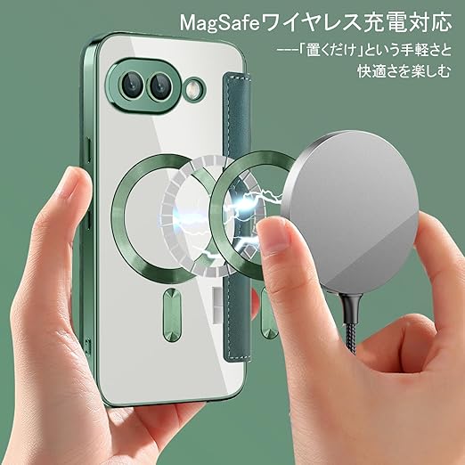 【REHOOF】google pixel9a 用 ケース 手帳型 magsafe対応 背面 透明 クリア 財布型 マグセーフ 手帳 カード収納 ワイヤレス充電対応 カード入れ PU革 レザー Pixel 9a スマホケース おしゃれ 軽量 薄型 防塵 耐衝撃 全面保護 スマホカバー(グリーン) a