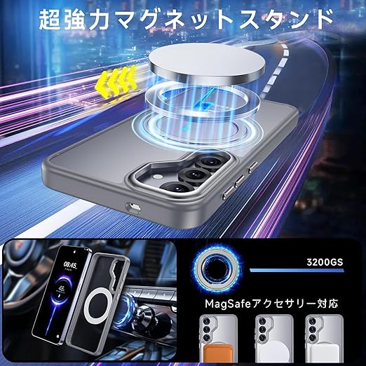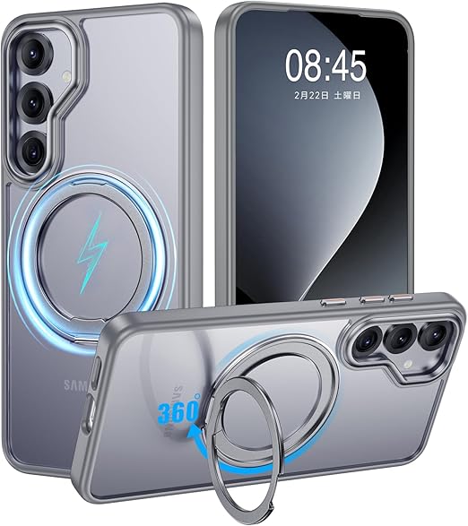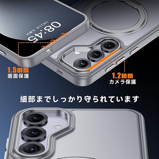 【米軍MIL規格・Magsafe対応】Galaxy S25 用 ケース MagSafe対応 リング 360°回転スタンド機能 縦横両対応 半透明 黄ばみ防止 ワイヤレス充電 レンズ保護 耐衝撃 携帯カバー ギャラクシー S25 カバー マグネット搭載 車載ホルダー マグセーフ対応 おしゃれ(グレー) a