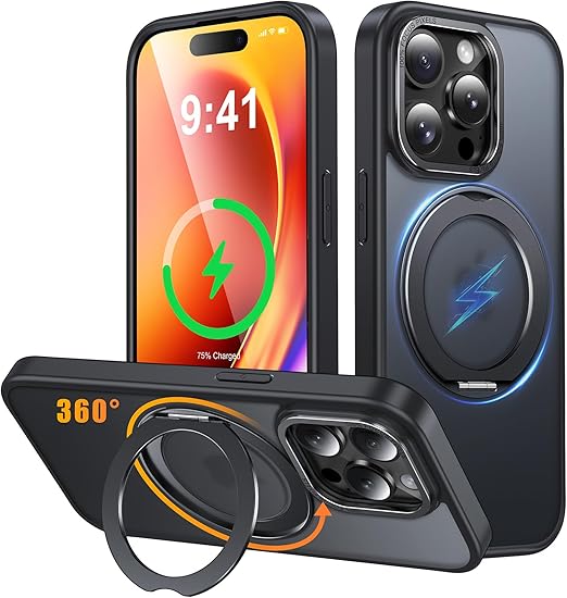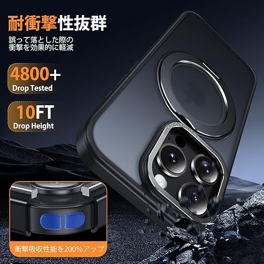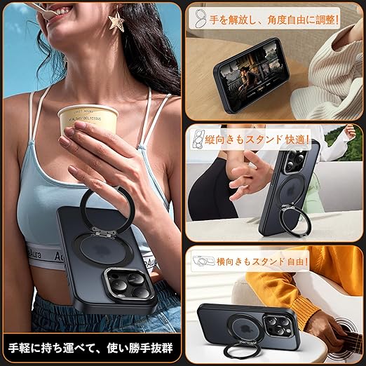 iPhone 13 Pro 用 ケース Magsafe対応 ワイヤレス充電 360°回転スタンド 縦横両対応 Gunwon スマホケース iphone13 Pro 用 米軍規格 耐衝撃 半透明 マット感 マグセーフ 防指紋 リング マグネット搭載 アイフォン13プロ 用 カバー「ブラック」 a