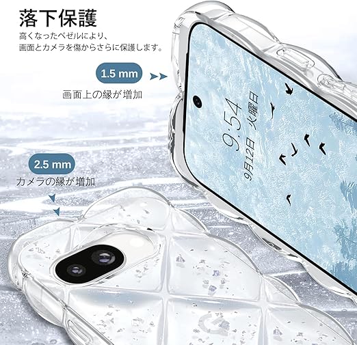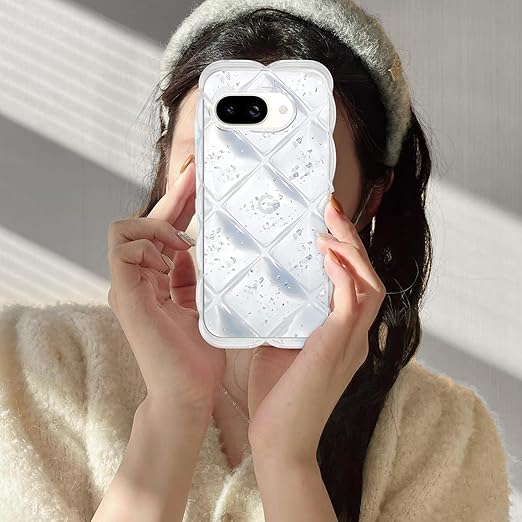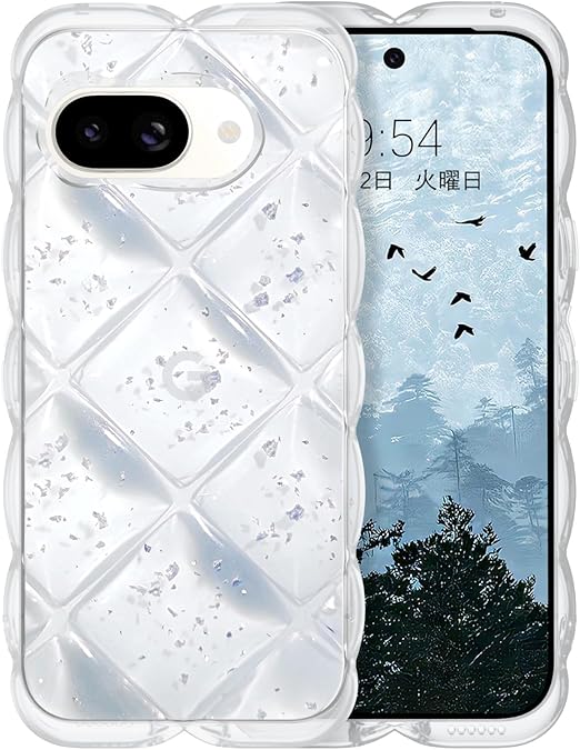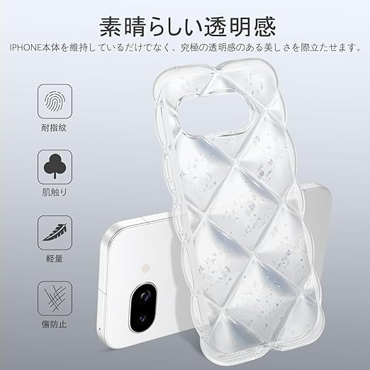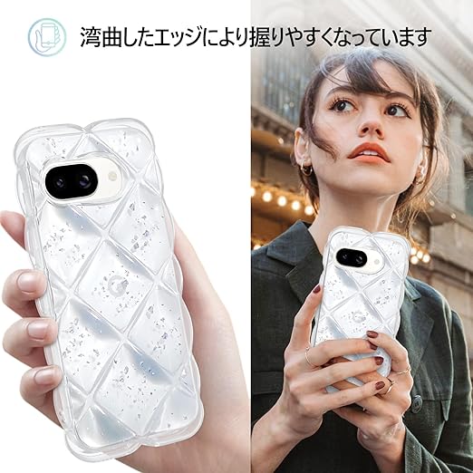 【Google Pixe 9A対応】このPixe 9Aクリアケースは透明TPUとウェーブエッジ、背面ダイヤモンドひし形ふわふわとアルミ箔シルバーキラキラ装飾で作られており、光の下でダイヤモンドのように輝き、高級感を醸し出します。