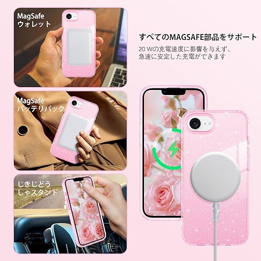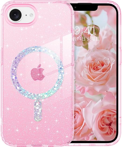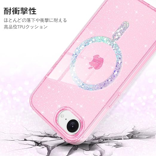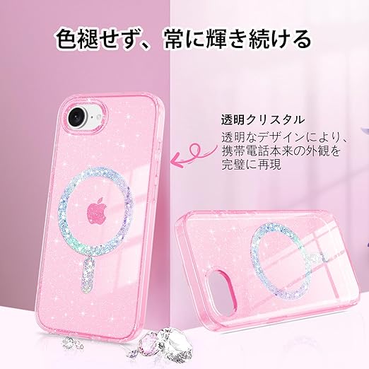 YINLAI iPhone 16e 用 ケース クリア ピンク 耐衝撃 かわいい キラキラ マグネット式 米軍MIL規格 耐久性 黄ばみ防止 アイホン16Eケース ワイヤレス充電対応 iPhone 16e 2025 6.1インチ 用 かわいい携帯ケース 女性用 a