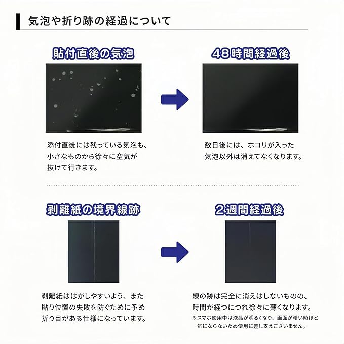 【自動修復技術、気泡消滅機能】保護フィルム自己修復機能がありますので、保護フィルムの上に小さな気泡がある場合、24-48時間以内に自然に消えて無くなりますのでご安心ください。