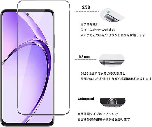 【対応機種】OPPO A3 5G ガラスフィルム、2枚セット。本ガラスフィルムはOPPO A3 5G本体端部のカーブによるフィルム剥がれや、浮き上がりの防止、スマホケースの装着スペースを確保するため、OPPO A3 5G本体の曲面の縁にスペースを残すデザインとなっています。