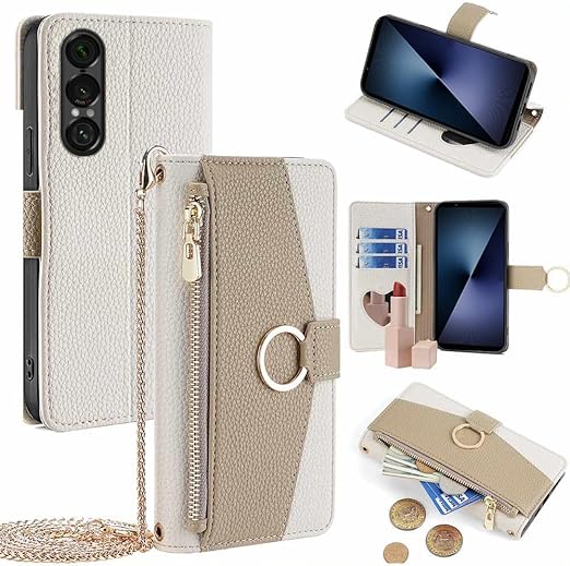 Xperia 1 VII ケース 手帳型 エクスペリア1 vii ケース 手帳型 エクスペリア1vii カバー ショルダー ストラップ付き スタンド機能 カード収納 ミラー付き 耐衝撃 肩掛け おしゃれ 女性 柔らかいTPU TOO&SOO Xperia1VII スマホケース 斜め掛け - オフホワイト a