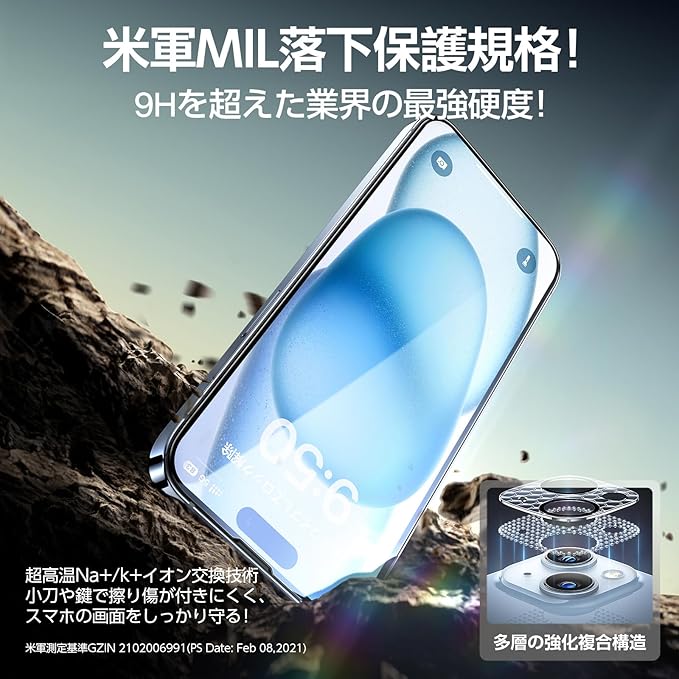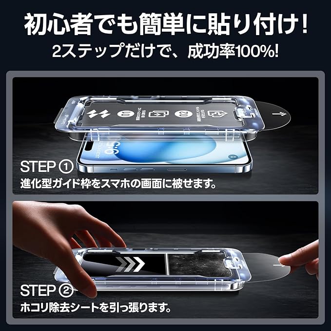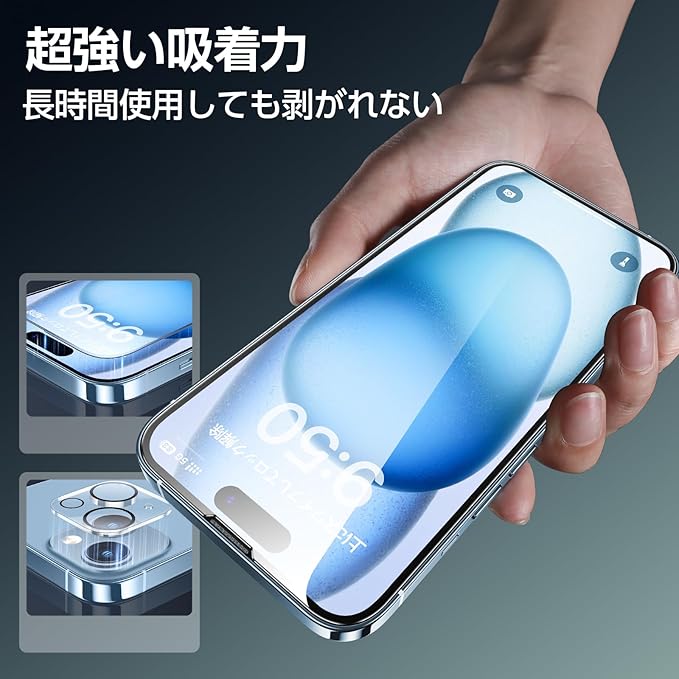 【対応機種・アフターサービス】こちらのガラスフィルムはiPhone15 用(6.1インチ)に対応しております。パッケージ内容:ガラスフィルム×2、レンズフィルム×2、画期的なガイド枠×1、取扱説明書×1、補助ツールキット×2 万一、初期不良やご使用中にホコリ、気泡、割れが発生した場合があれば、ご遠慮なく、弊社とお気軽にご連絡してください。365日の保証期間内に、お客様からのお問い合わせ内容に応じて1回の代替品交換・返金対応を提供致します。いphone15 対応 ガラスフィルムの貼り付け方の動画は