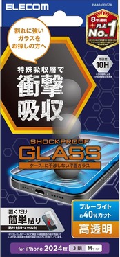 特殊な衝撃吸収層を採用し、衝撃から画面を守るSHOCKPROOFのブルーライトカットタイプの画面保護ガラスフィルムです。