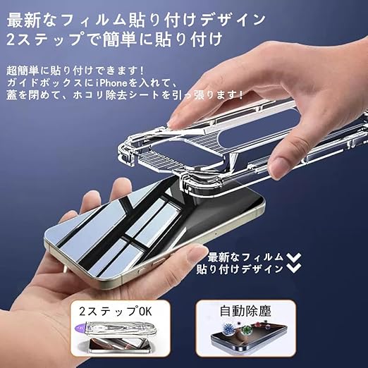 【最新なフィルム貼り付けデザイン・2ステップOK】超簡単に貼り付けできます!被せる、引っ張る、たった2ステップで初心者でも簡単に貼り付けます。フィルムも自然と吸着する構造になっているため、静電気を利用してスクリー