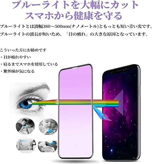 【ブルーライトカット機能 】 先進ブルーライトカット反射技術によりブルーライトを大幅にカットでき。 ちなみに、弊社製品は本物同様正面から見ると、淡い黄色に見え、側面から見ると、青紫色に見えます。(ブルーライトの部分が吸収され、三原色の赤と緑との割が増えて、淡い黄色に見える。) (ご注意:色あいなど画像と若干の違いがある場合があります。予めご了承下さい。)