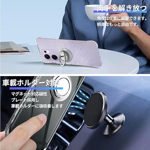 【スタンド機能 & 車載ホルダー対応】後ろに付いているフィンガーリングはスタンド機能はもちろん、滑りにくくて持ちやすい、安定的なグリップが特徴です。リングはケースにしっかり固定されていて、縦置き、横置きどんな角度でも固定できます。360度回転可能、180角度調節可能、携帯電話でビデオを見るのはとても便利です