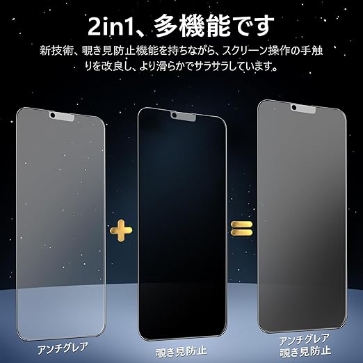 【2in1・多機能】 新技術を取り入れた2in1保護フィルムは、アンチグレア&覗き見防止機能を兼ね備えています。画面操作時の手触りをさらに改良し、より滑らかでサラサラな使い心地を実現しました。 【対応機種】 iPhone 13 Mini 用(5.4インチ対応)。【パッケージ内容】 iPhone13 Mini ガラスフィルム * 1枚セット + iPhone13Mini カメラフィルム * 1枚セット + ガイド枠 * 1枚。