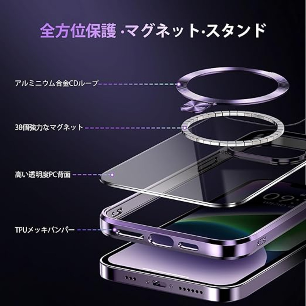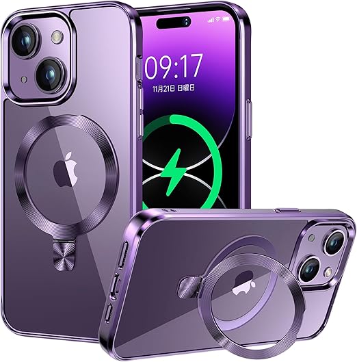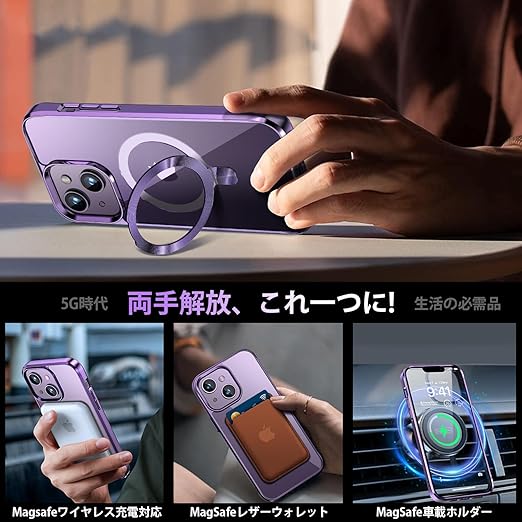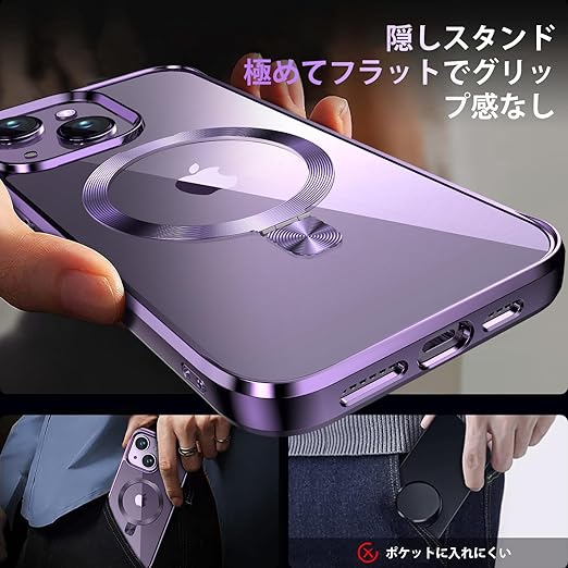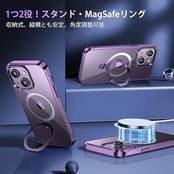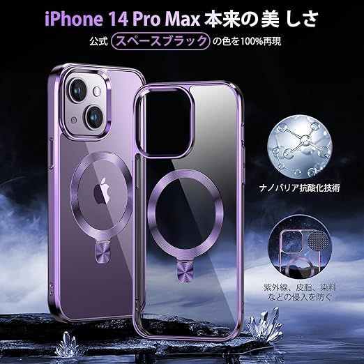 【CD MagSafeリング・スタンド一体】iPhone14 Plus 用クリアケース[MagSafe対応・隠しスタンド] [本体の色・メッキバンパー]ストラップホール付き 角度調整可 米軍MIL規格取得・耐衝撃 アイホン14 Mini透明ケース スマホケース14プラス人気 6.7インチ(ディープパープル) a