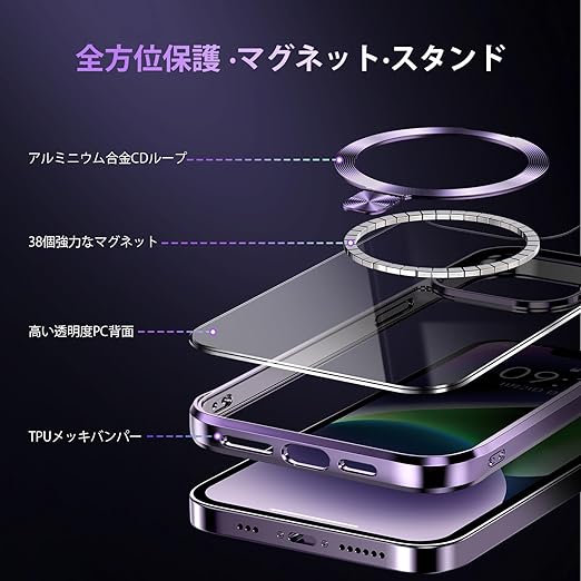 【CDパターン磁石リング・NEO永久磁石技術】 CD レコードの質感からインスピレーションを得たこのデザインはアルミニウム合金製で、iPhone 14 PlusケースのMagsafe リングと統合されています。CDパターンの質感の金属光沢とシェルの電気メッキフレームは非常に高級感があり、あなたのiPhone 14 Plusをユニークにします。このアイフォン 14 Plusケースの隠しスタンド内部に「NEO永久磁石技術」配列永久磁石を使用し、iPhoneと同じタイプの輸入高コスト磁石コア、iPho