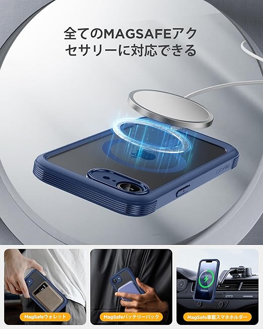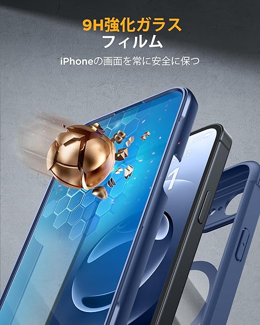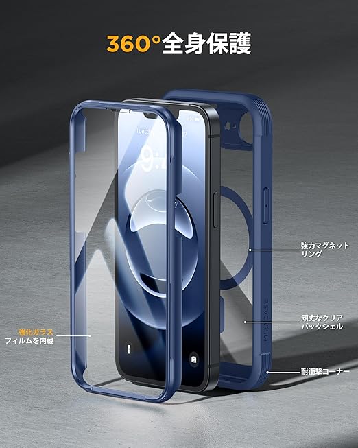 Miracase iPhone 16E ケース MagSafe対応 あいふおん16e スマホケース 2025 9H強化ガラス 6.1インチ フルカバー 360°全身保護 ワイヤレス充電対応 ダークブルー a