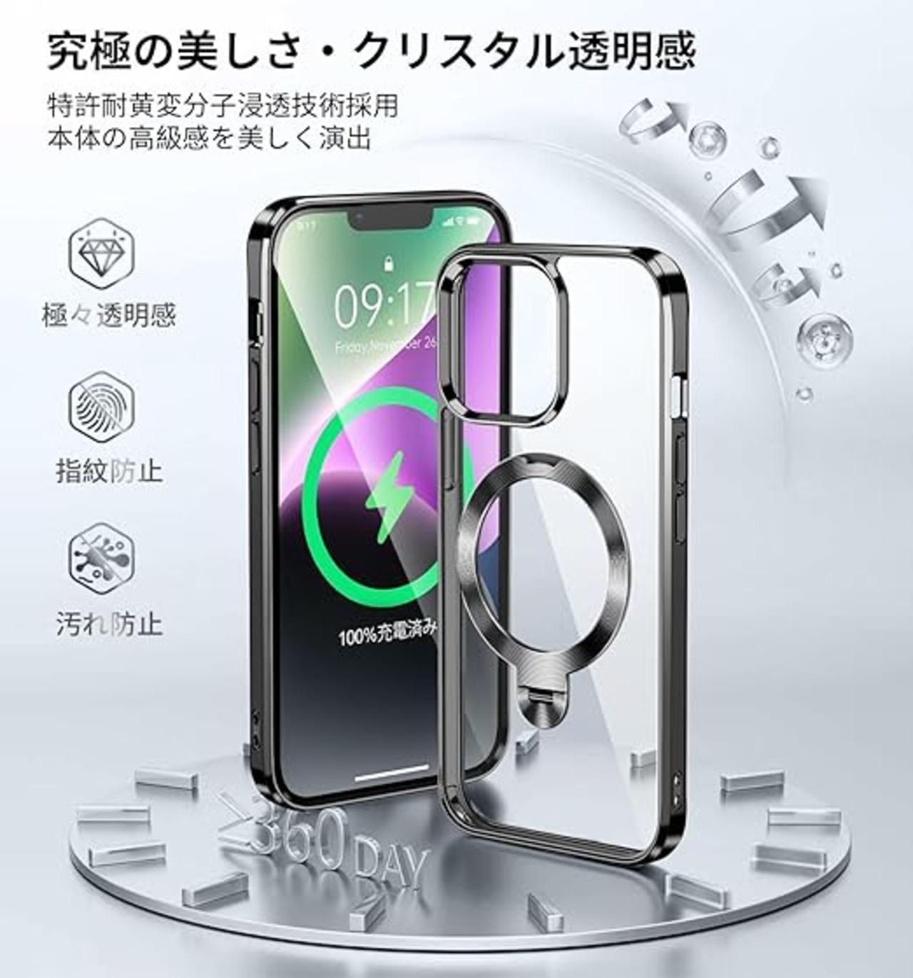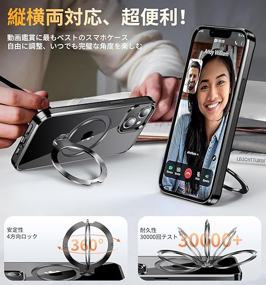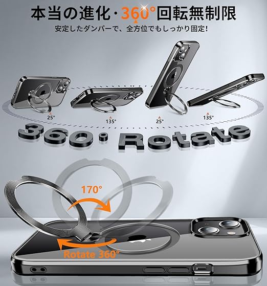 【本当の進化・360°定点回転神スタンド】このiPhone 14ケースは革新的な360度定点回転スタンドを採用し、縦置き・横置きどちらでも0°から170°まで自由に調整できます。iPhone 14専用設計で、ビデオ通話や映画鑑賞時に両手を完全に解放し、快適な使い心地を存分に与えます。このアイホン14ケースのヒンジは強化航空材料を使用して改良されており、耐久性と安定性に優れ、リングの緩みや破損のリスクを完全に解消しました。30,000回の耐久テストをクリアし、耐久性は通常製品より80%に向上!さら