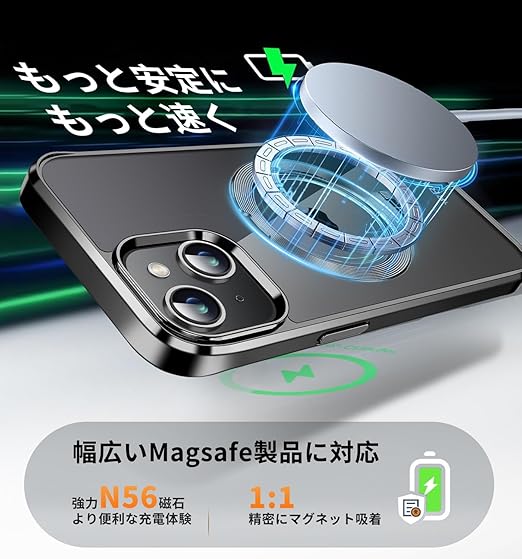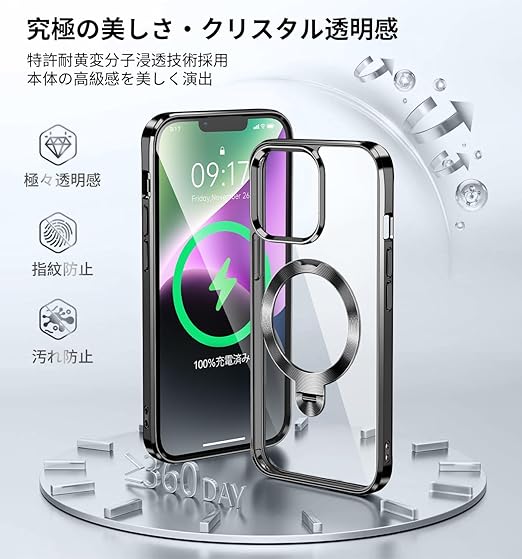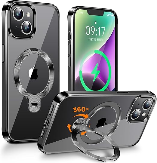 【360°回転無制限・縦横両対応】FONKCASE iPhone 14 用 ケース Magsafe対応【CDリング・スタンド一体】角度調整可能 ストラップホール付き【本体の色・メッキバンパー】アイフォン14 用 カバー マグネット搭載 耐衝撃 高耐久性 透明 黄変防止 ワイヤレス充電対応 いphone14 用 ケース 6.1インチ(ブラック) a
