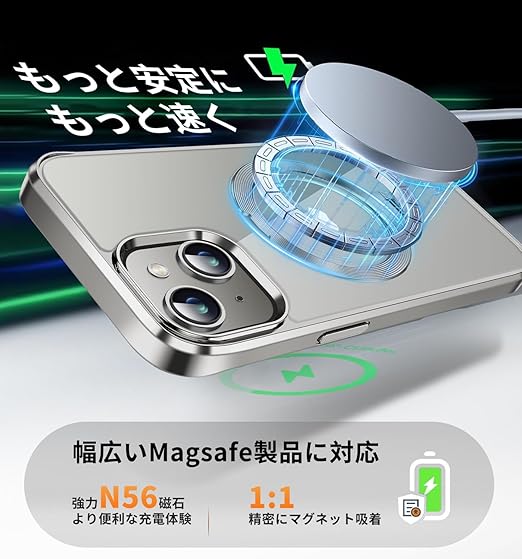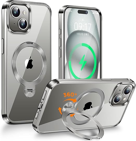 【360°回転無制限・縦横両対応】FONKCASE iPhone 15 用 ケース Magsafe対応【CDリング・スタンド一体】角度調整可能 ストラップホール付き【本体の色・メッキバンパー】アイフォン15 用 カバー マグネット搭載 耐衝撃 高耐久性 透明 黄変防止 ワイヤレス充電対応 いphone15 用 ケース 6.1インチ(グレー) a