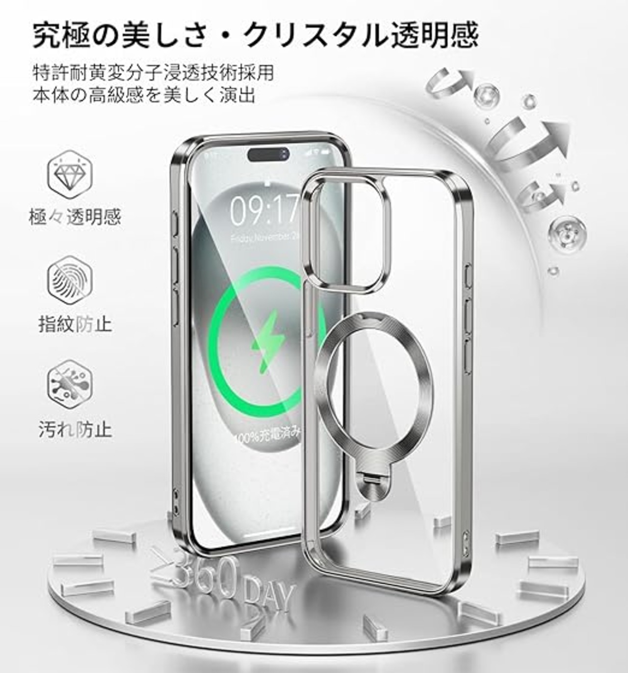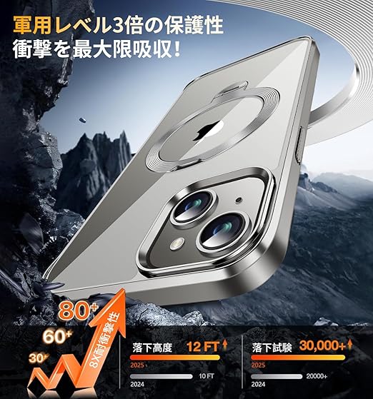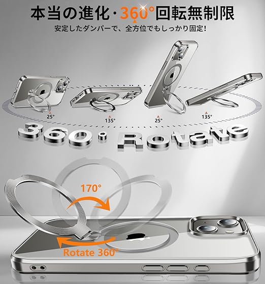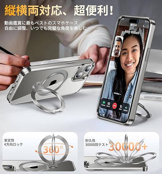 【本当の進化・360°定点回転神スタンド】このiPhone 15ケースは革新的な360度定点回転スタンドを採用し、縦置き・横置きどちらでも0°から170°まで自由に調整できます。iPhone 15専用設計で、ビデオ通話や映画鑑賞時に両手を完全に解放し、快適な使い心地を存分に与えます。このアイホン15ケースのヒンジは強化航空材料を使用して改良されており、耐久性と安定性に優れ、リングの緩みや破損のリスクを完全に解消しました。30,000回の耐久テストをクリアし、耐久性は通常製品より80%に向上!さら