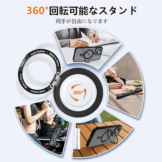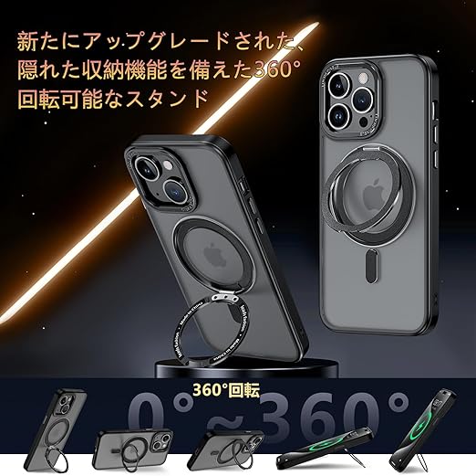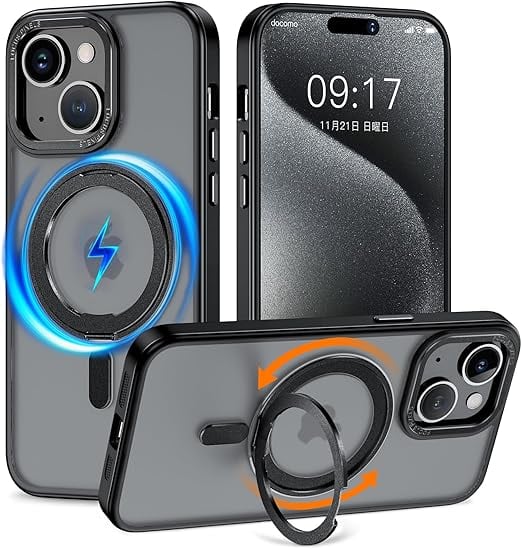 KMAMBNG iPhone14 用 ケース 縦横両対応 リング 【多機能360度回転スタンド】MagSafe対応 ワイヤレス充電対応 半透明マット スマホケース 米軍規格 耐衝撃 カメラレンズ保護 車載ホルダー対応 6.1インチ いphone14用ケース (ブラック, iPhone 14) a