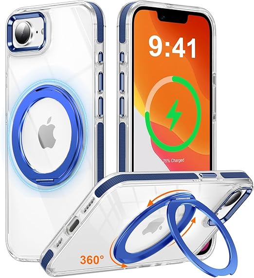 iPhone 16e 用 ケース 多機能360度回転スタンド 縦横両用 マグネット搭載 MagSafe対応 滑り止めドット模様 OURJOY スマホケース アイフォン 16e クリア リング カバー 軽量 米軍規格 耐衝撃 ワイアレス充電対応 滑り止め新構造 手持ち撮影 安定性・ブルー a