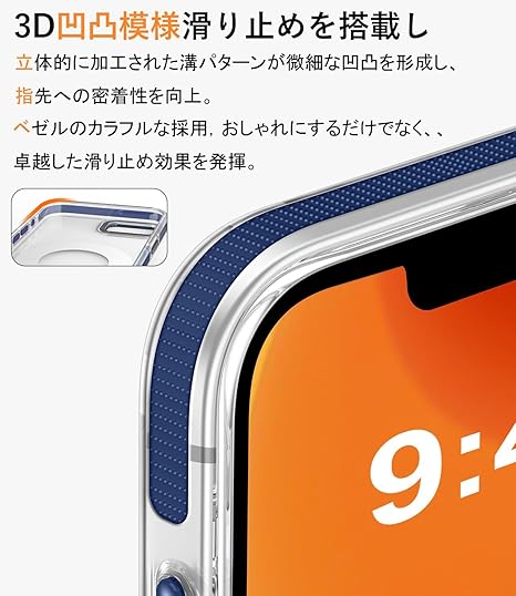 『革新的滑り止めドット模様』スマホケースのフレーム周囲には滑り止め用の立体的な溝パターンが刻まれており、手元が安定する設計。細かな凹凸が指先への密着感を高め、落下防止に効果的な滑り抵抗を生み出す