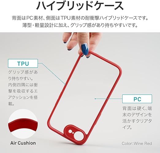 【耐衝撃】 衝撃を吸収するTPUと、硬く高透明なポリカーボネートのハイブリッドケース