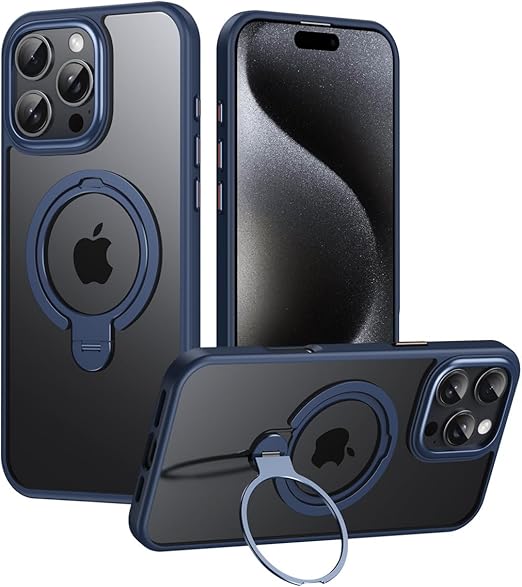 2024新登場 ダブルリング iPhone 15 ケース Magsafe対応 縦置き 定点360度回転 フラット収納リング アイフォン15 リングケース 耐衝撃 艶消し 透明 クリア マグセーフケース,ブルー a