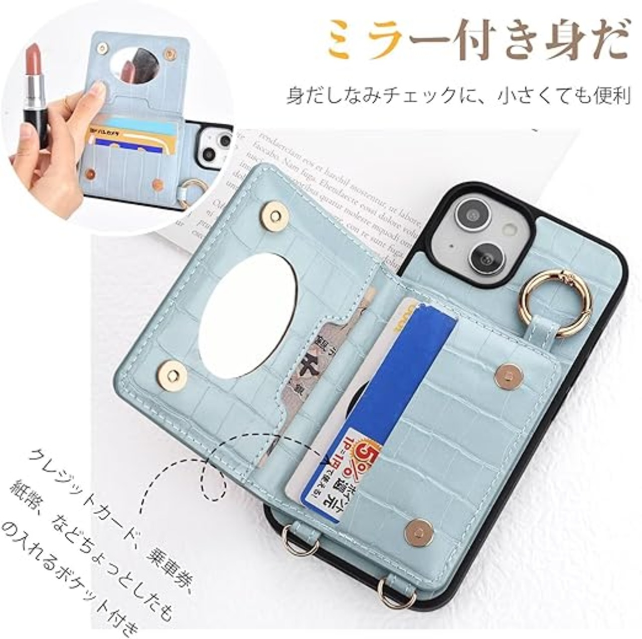 【横置きスタンド機能・ミラー付き】 裏面のカードケースを開ければ横置きのスタンドに変われます。見やすい角度に固定して、ハンズフリーで動画を観たり、本を読んたりすることができます。旅中の長時間移動でもお気に入りの動画を心地良い角度で
