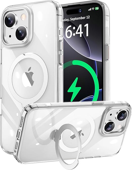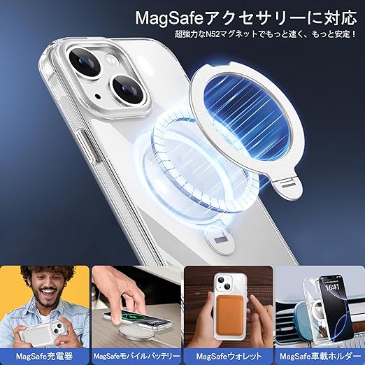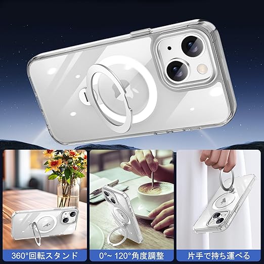 KISECASE iPhone 15 用 ケース magsafe対応 ワイヤレス充電 磁気リング マグネット搭載 定点360度回転スタンド付き 耐衝撃 耐久性 黄ばみ防止 滑り止め 落下保護 傷防止 携帯ケース アイフォン15用 カバー リング付き ストラップホール付き (クリア, iPhone 15 用) a