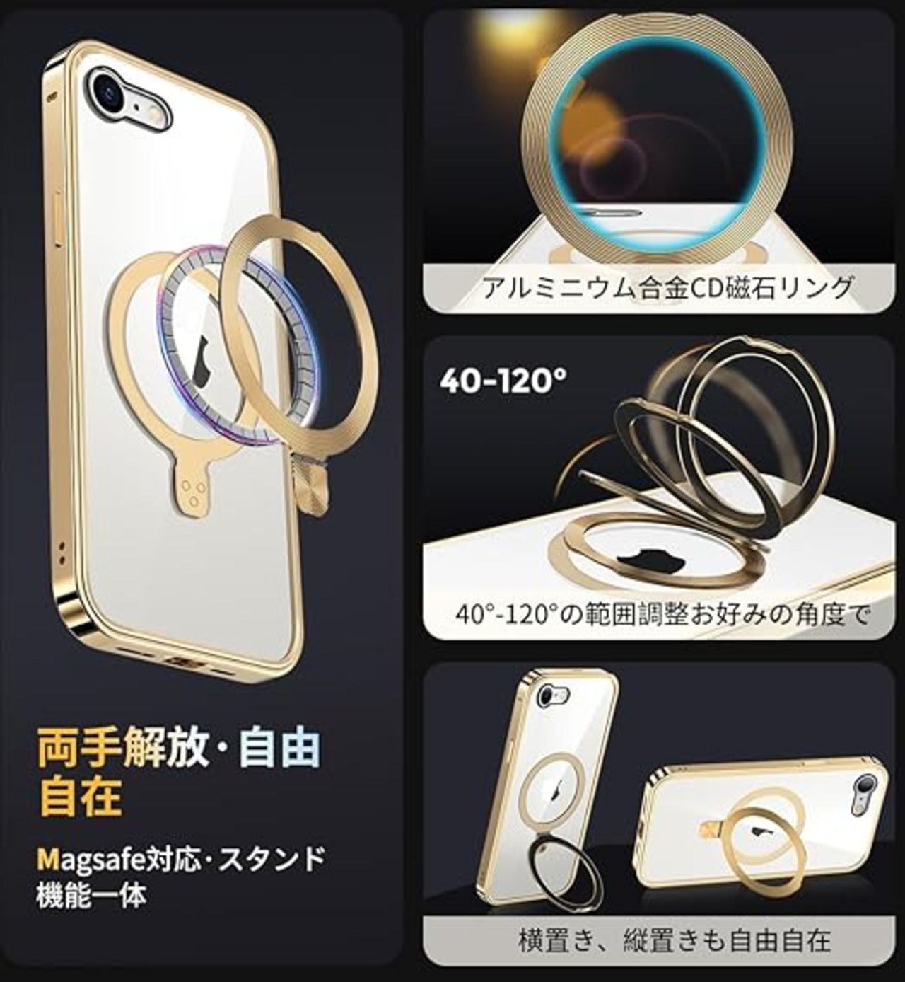 【全面革新!スタンド・CDリング・Magsafe対応】このiPhone SE3 ケース iPhone SE2 ケースは、動画鑑賞に便利なスタンド、CDパターンの質感の金属光沢のスマホリング、バッチリ付くMagsafe充電対応、多機能を一体化にしている、より便利で快適な暮らしを実現!このiPhone se 第3世代 ケースは、高品質のアルミニウム合金CD磁石リングを搭載し、おしゃれで高級感が溢れています。3Way置き対応、縦横とも自由自在、40ºー120º回転可能で、最適な視野角を調節できます。こ
