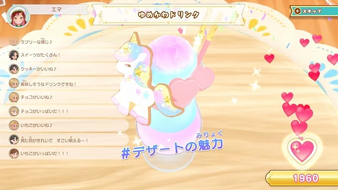 デビュープロジェクト クッキングカフェとは・・・プレイヤーはカフェの新人店員として、お客さんからのオーダーを受け、ミッションにチャレンジしながら、SNS映えするお料理を制作。その作った料理をゲーム内のSNSに投稿し“いいね”をもらったり、“お店の評価”を上げたりして、目標フォロワー100万人の超有名店を目指すお料理ゲームです。おしゃれなカフェの店員となって、作れるメニューは全部で80種類!フレーバーの選択や、多彩なトッピングでたくさんのお料理制作体験を13種類のミニゲーム形式で楽しもう!